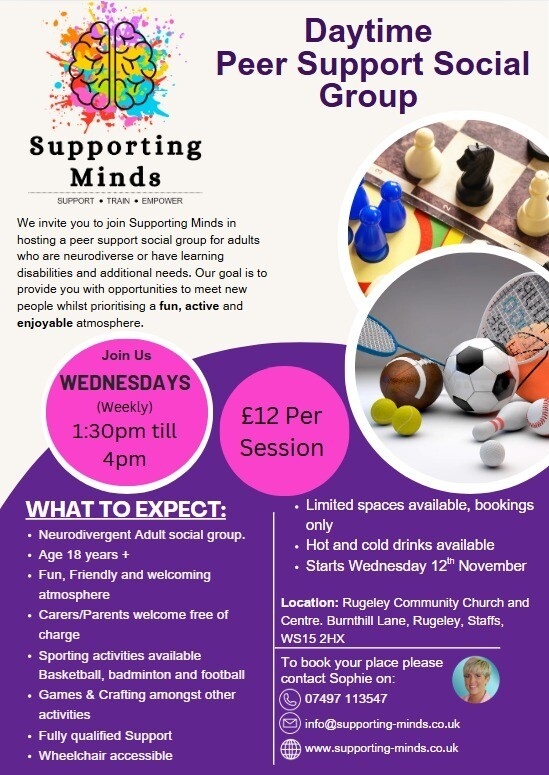 Come and join our daytime social group in Rugeley, Staffordshire. A welcoming space to meet new people, enjoy weekly activities, and feel part of a community. From sports like badminton, football, and basketball to gaming, board games, crafting, and themed days, there’s something for everyone. Whether you're looking for friendship, fun, or simply a relaxed place to connect, we’d love to see you there.